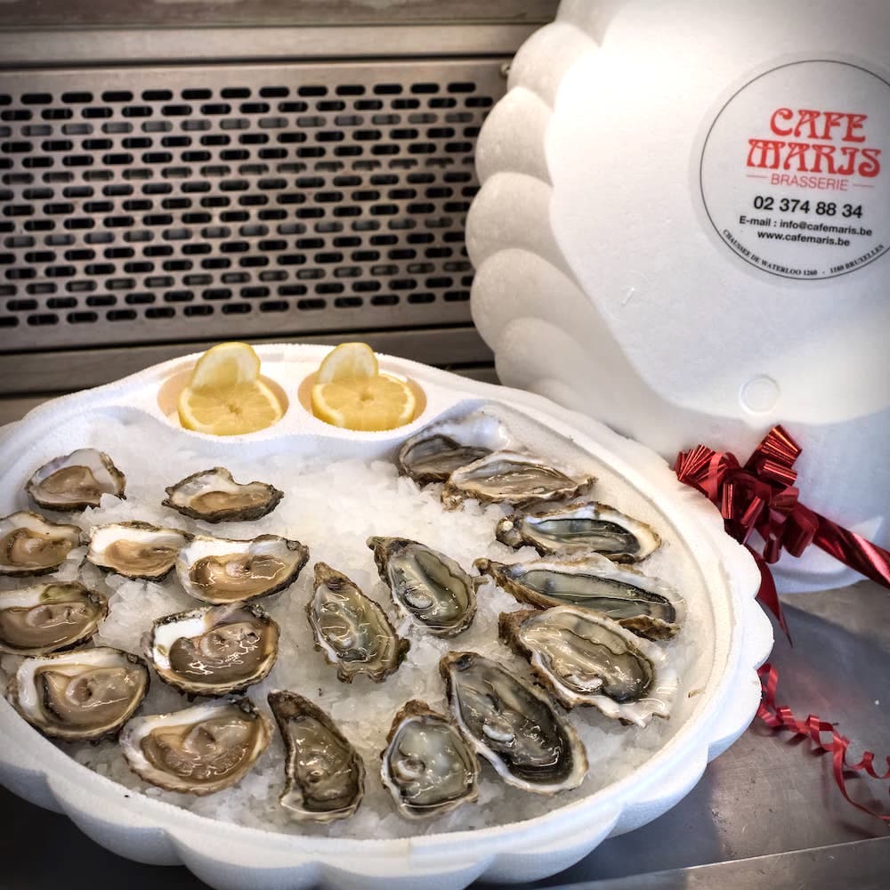 Plateau Dégustation : Assortiment de 20 huîtres creuses et plates : 6 Belons n°5, 4 Belons n°2, 4 Fines de Claire n°5, 2 Fines de Claire n°3, 2 Spéciales Vertes, 2 Belles de Quiberon